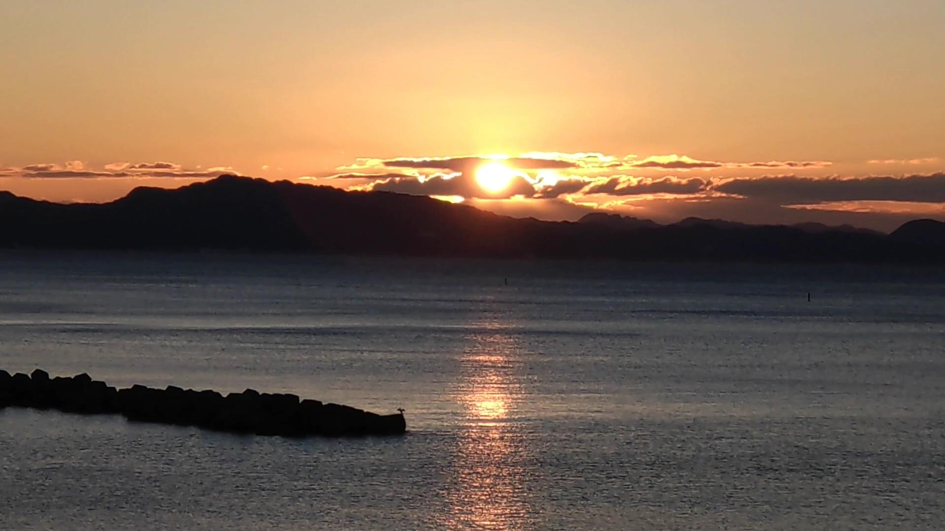 2022-01-05日の出の様子。雲の隙間から除く朝日が海面に薄っすら光の帯を創っています。